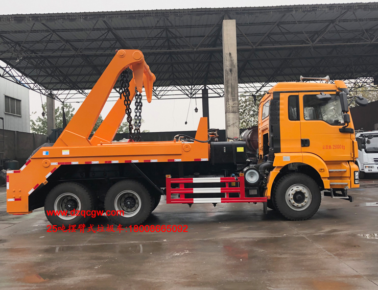 該車型屬于重型擺臂式,東正公司自主研發(fā)生產(chǎn)的特種環(huán)衛(wèi)車,核載25噸,可用于特種鋼廠拖運(yùn)鋼包、鐵水包。